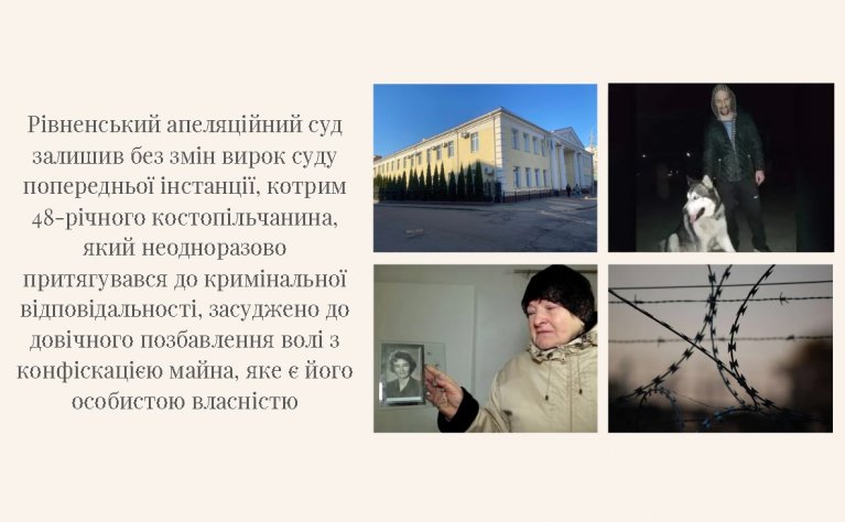 Рівненський апеляційний суд залишив без змін вирок суду попередньої інстанції, котрим 48-річного костопільчанина, який неодноразово притягувався до кримінальної відповідальності, у тому числі — у 2005 році за вчинення умисного вбивства, засуджено до довічного позбавлення волі з конфіскацією майна, яке є його особистою власністю.