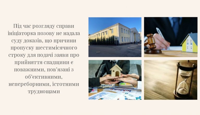 З урахуванням викладеного вище, суд не знайшов підстав для визначення позивачці додаткового строку для прийняття спадщини, оскільки під час розгляду справи вона не надала суду доказів, що причини пропуску шестимісячного строку для подачі заяви про прийняття спадщини є поважними, пов’язані з об’єктивними, непереборними, істотними труднощами. Фактичною причиною пропуску, на яку вказувала позивачка, була необізнаність із положеннями закону, яким встановлено строки звернення із заявою про видачу свідоцтва про спадщину, і таку причину суд не може вважати поважною та об’єктивною. Будь-які інші відомості про те, що позивачка протягом шестимісячного строку після смерті спадкодавця або з урахуванням змін щодо зупинення такого строку, але не більш ніж на 4 місяці, була позбавлена можливості звернутися до нотаріальної контори із заявою про прийняття спадщини, не встановлені.