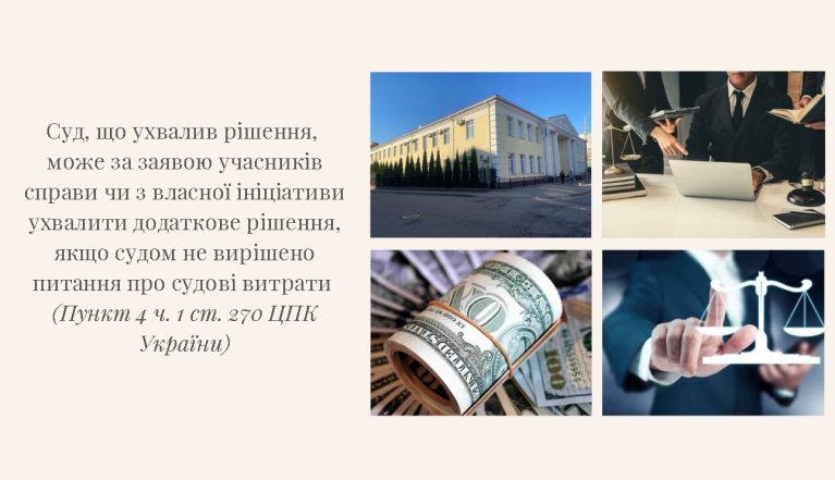 Відповідно до п. 4 ч. 1 ст. 270 ЦПК України суд, що ухвалив рішення, може за заявою учасників справи чи з власної ініціативи ухвалити додаткове рішення, якщо судом не вирішено питання про судові витрати.