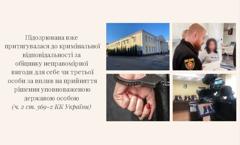 Проти задоволення апеляційної скарги захисника виступила прокурорка, просила залишити оскаржену ухвалу слідчого судді суду попередньої інстанції без змін, як законну й обґрунтовану, та додала, що підозрювана вже притягувалася до кримінальної відповідальності за обіцянку неправомірної вигоди для себе чи третьої особи за вплив на прийняття рішення уповноваженою державою особою (ч. 2 ст. 369-2 КК), на шлях виправлення не стала, а тому існують ризики переховування підозрюваної від органу досудового розслідування й суду, впливу на свідків та потерпілого. Також додала, що рієлторка у Слідчому ізоляторі утримується з 12 грудня й, перебуваючи на волі, мала можливість повернути потерпілому кошти.