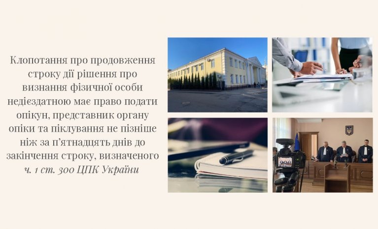 Клопотання про продовження строку дії рішення про визнання фізичної особи недієздатною має право подати опікун, представник органу опіки та піклування не пізніше ніж за п’ятнадцять днів до закінчення строку, визначеного частиною першою цієї статті.