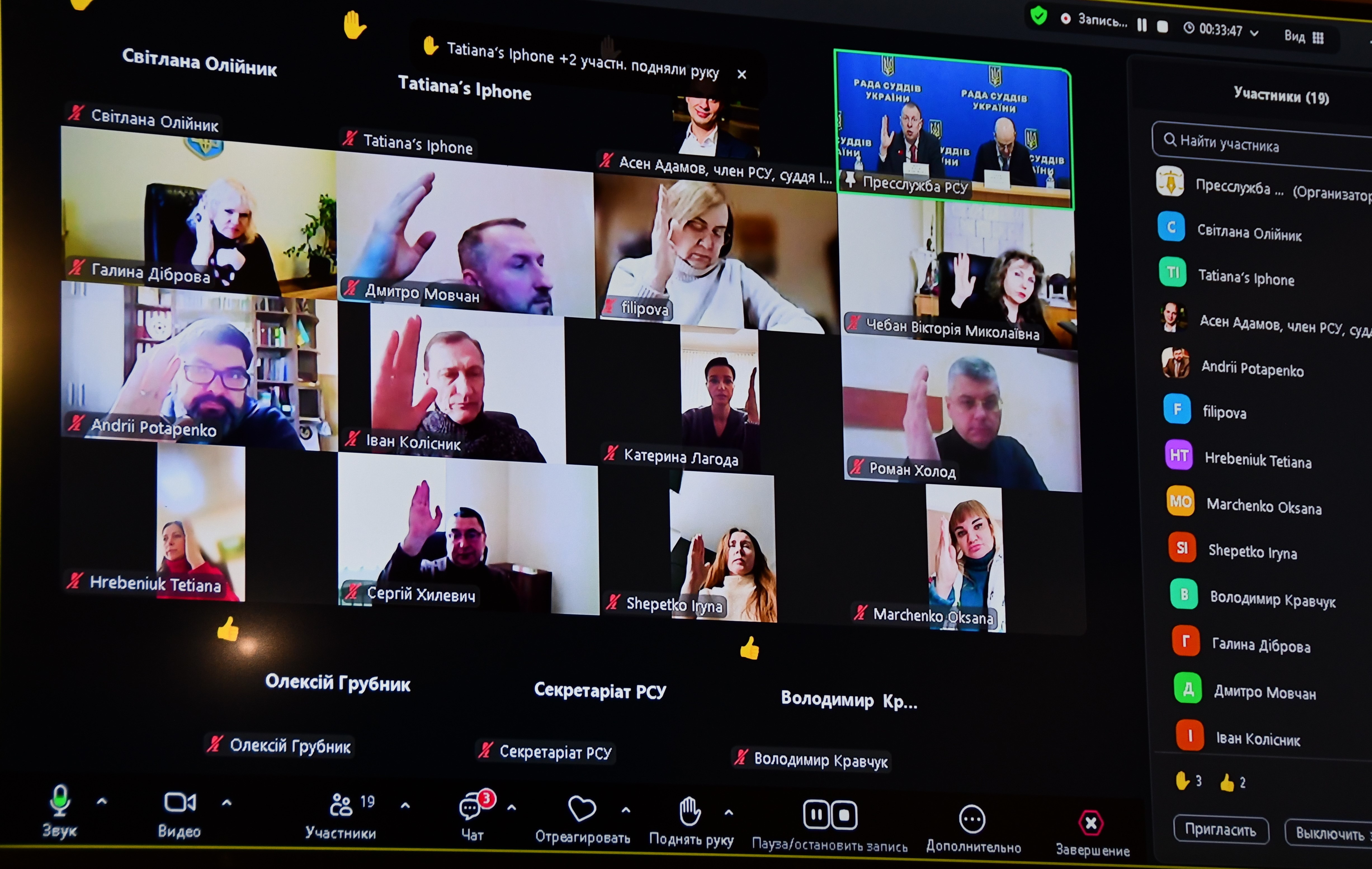 Пресслужба РСУ повідомила, що засідання проходило в змішаному режимі: у залі засідань Ради та з використанням платформи для відеоконференцій Zoom. У засіданні взяли участь 24 член Ради суддів України. У засіданні також взяв участь Голова Державної судової адміністрації України Максим Пампура.